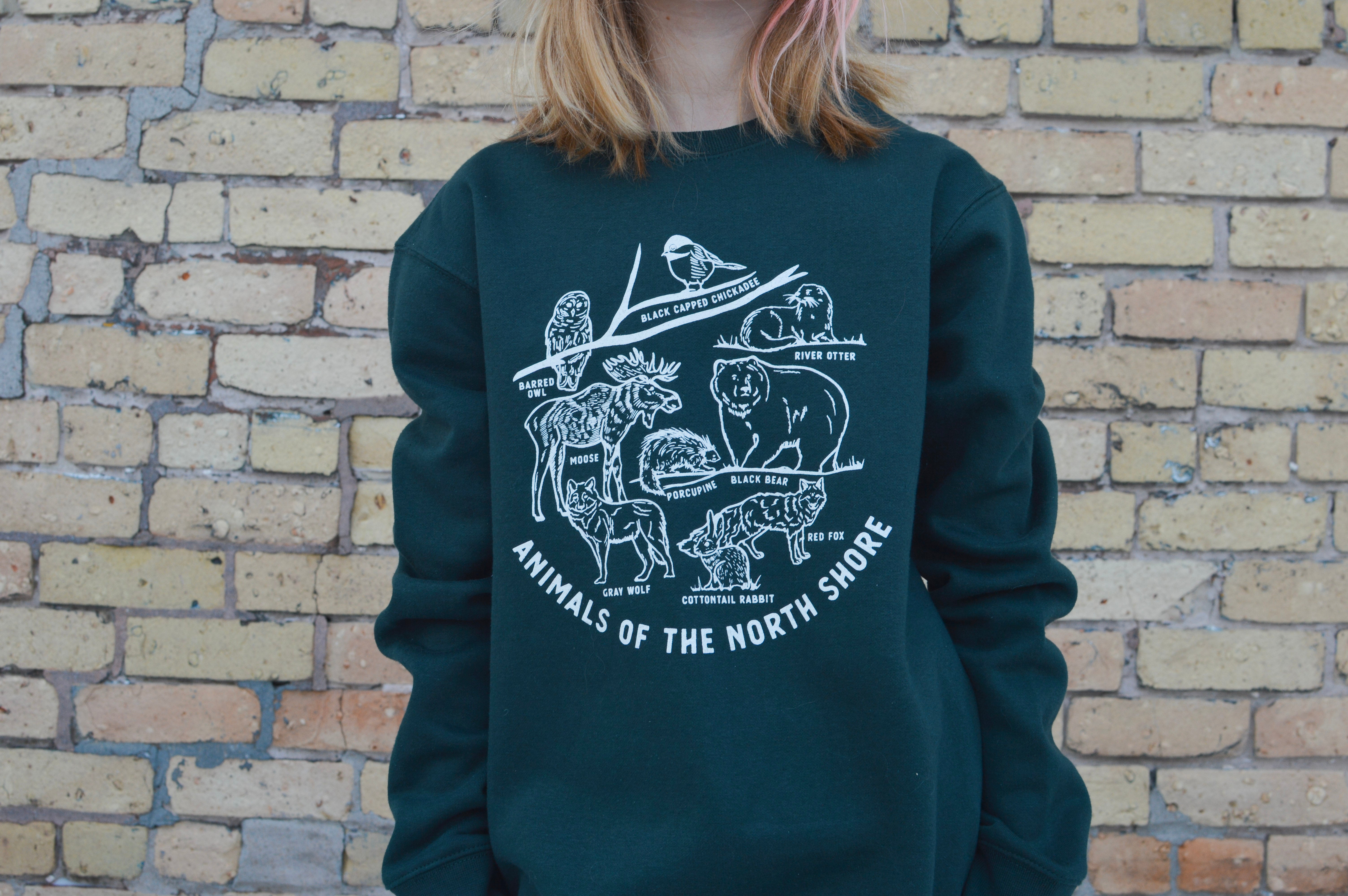 This "Animals of the North Shore" Youth Crewneck Sweatshirt comes styled in a beautiful dark forest green with white print or blue heather with black print. Features some majestic and adorable animals from the North Shore such as the black-capped chickadee, barred owl, moose, river otter, black bear, porcupine, gray wolf, cottontail rabbit, and red fox.