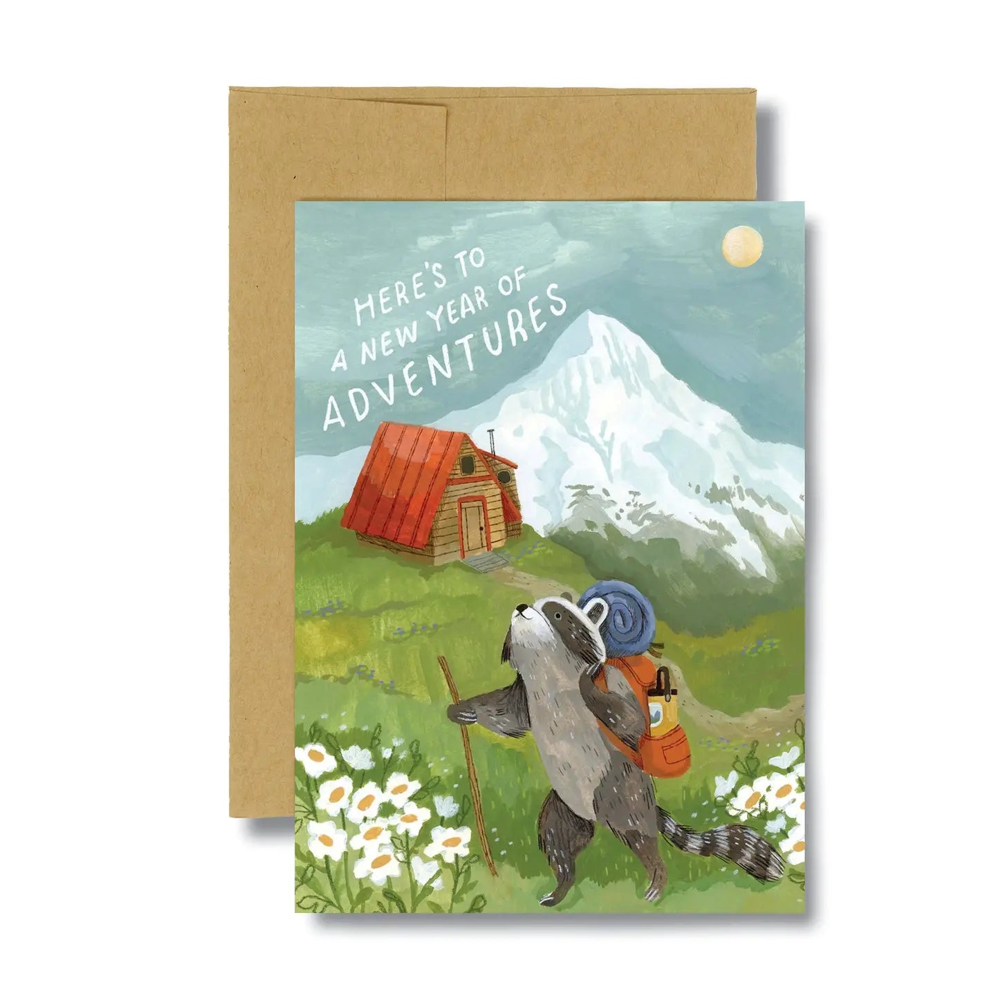 Features image of raccoon setting off on a journey with beautiful mountain flowers and cabin and the words, "Here's to a New Year of Adventures." Perfect as a housewarming card, graduation card, birthday card, or any event celebrating adventures that lie ahead.