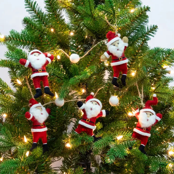 Dancing Santas for the tree or mantel will have everyone ready to sing and dance to their favorite carol. The quality felting and durable nature make them great decor year after year. Approximately 44" Long. Made from 100% natural wool; no harsh chemicals are used during production. Our felt goods are handmade in Nepal in our family-owned workshop that follows fair trade practices.