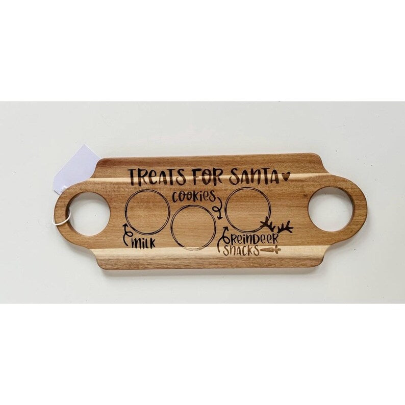 This Treats for Santa board come in two different shapes and sizes. It is laser engraved, food safe and perfect for your littles ones on Christmas Eve! There is an option to Customize your board by getting your family name or kids names engraved on the board. All Treats for Santa trays are Acacia wood.