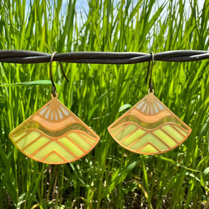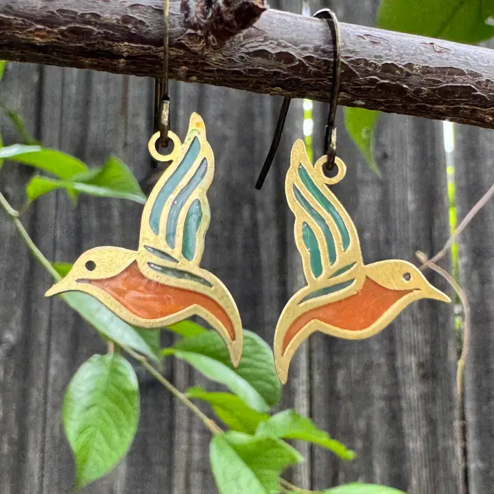 This modern earring features a brass nature-inspired design with soft-colored resin-stained glass that catches the light beautifully. Handmade with high-quality components and solid brass findings, these delicate yet durable earrings are lightweight and comfortable to wear. Color may very slightly. Photos & Description by Wild Lupine Folkcraft