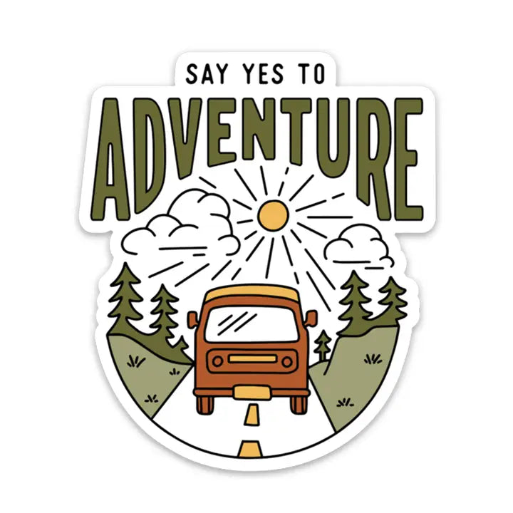 This sticker with an orange van along a dotted highway among trees, blaring sun, clouds and grass will have you wanting to hit the open road and "Say Yes to Adventure." The perfect sticker for all of your accessories - whether it’s on your vehicle, laptop or water bottle! These stickers are easy to apply and almost impossible to destroy.