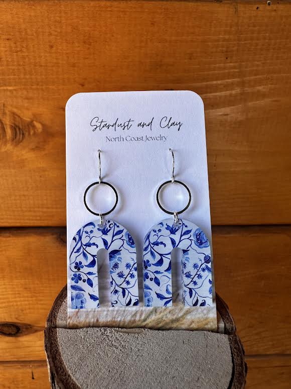 Blue Speckled Arch Earrings$22.00These earrings are handmade by local artist Stardust & Clay. Silver Hook Size: 3" Long by 1 1/4" at widest point