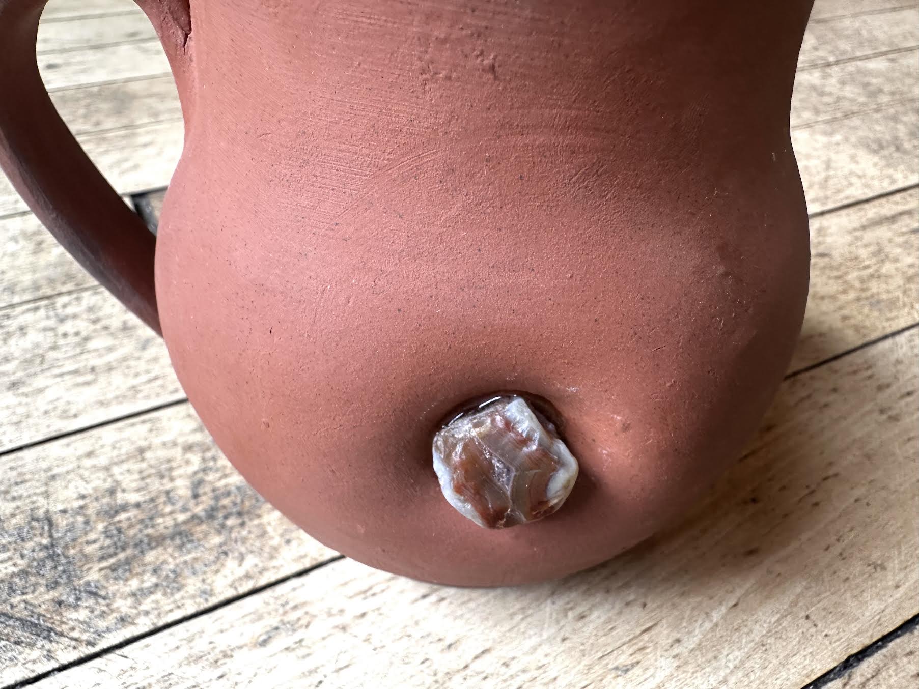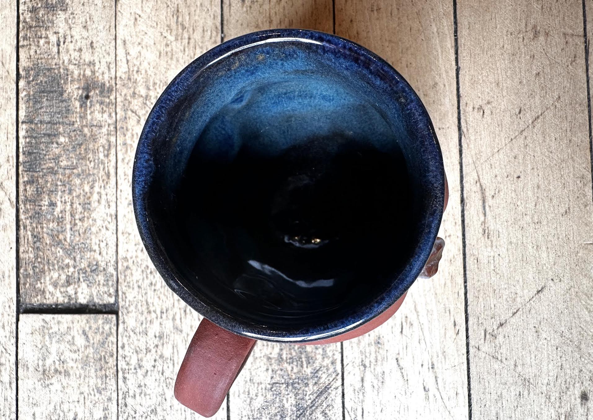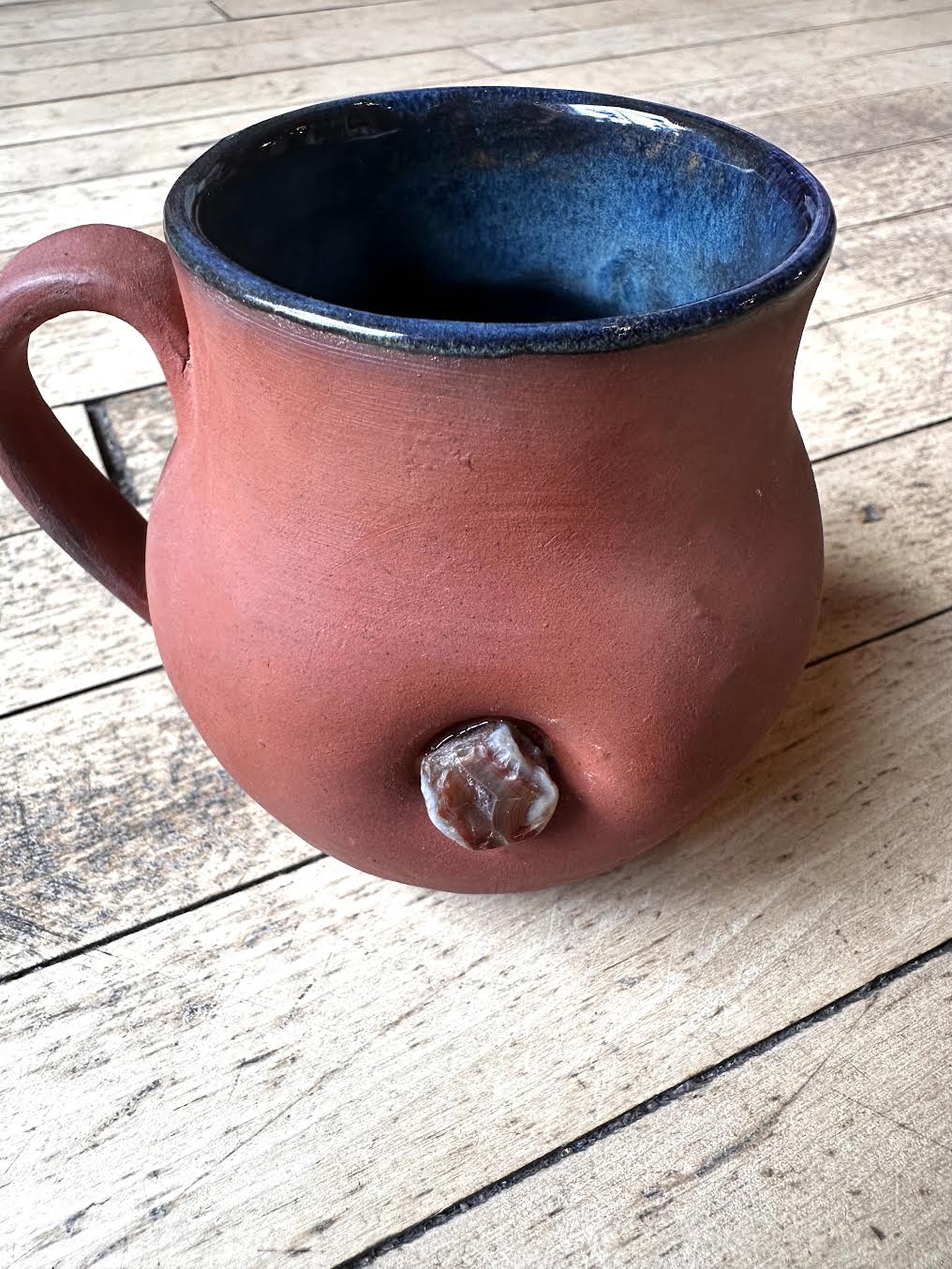 This handcrafted mug features a Lake Superior agate inlaid into its matte terracotta exterior, with a deep blue shining inner glaze.