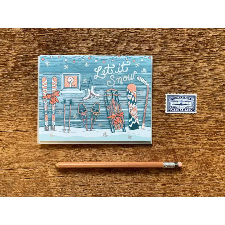 Digital and foil printed folded cards, blank inside Size A2 (4-1/4" x 5-1/2") Image Description: a folded digitally printed card with various skis and snowboards leaning against a wall, the silver text "Let it Snow" in the top right corner All images, prints, and photos copyright © Noteworthy Paper & Press